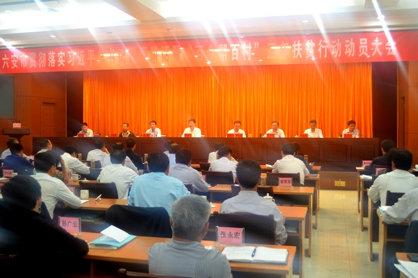 本报讯(尚慧)6月2日上午,市委、市政府召开六安市贯彻落实习近平总书记重要讲话暨“百企帮百村”三年扶贫行动动员大会。市领导孙云飞、毕小彬、王琦、束学龙、闻宝强、章立奇、聂保国、孙学龙出席会议。